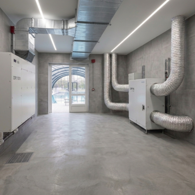 In winter, it dehumidifies efficiently and uses heat effectively; in summer, it provides fresh air without overheating the pool hall.